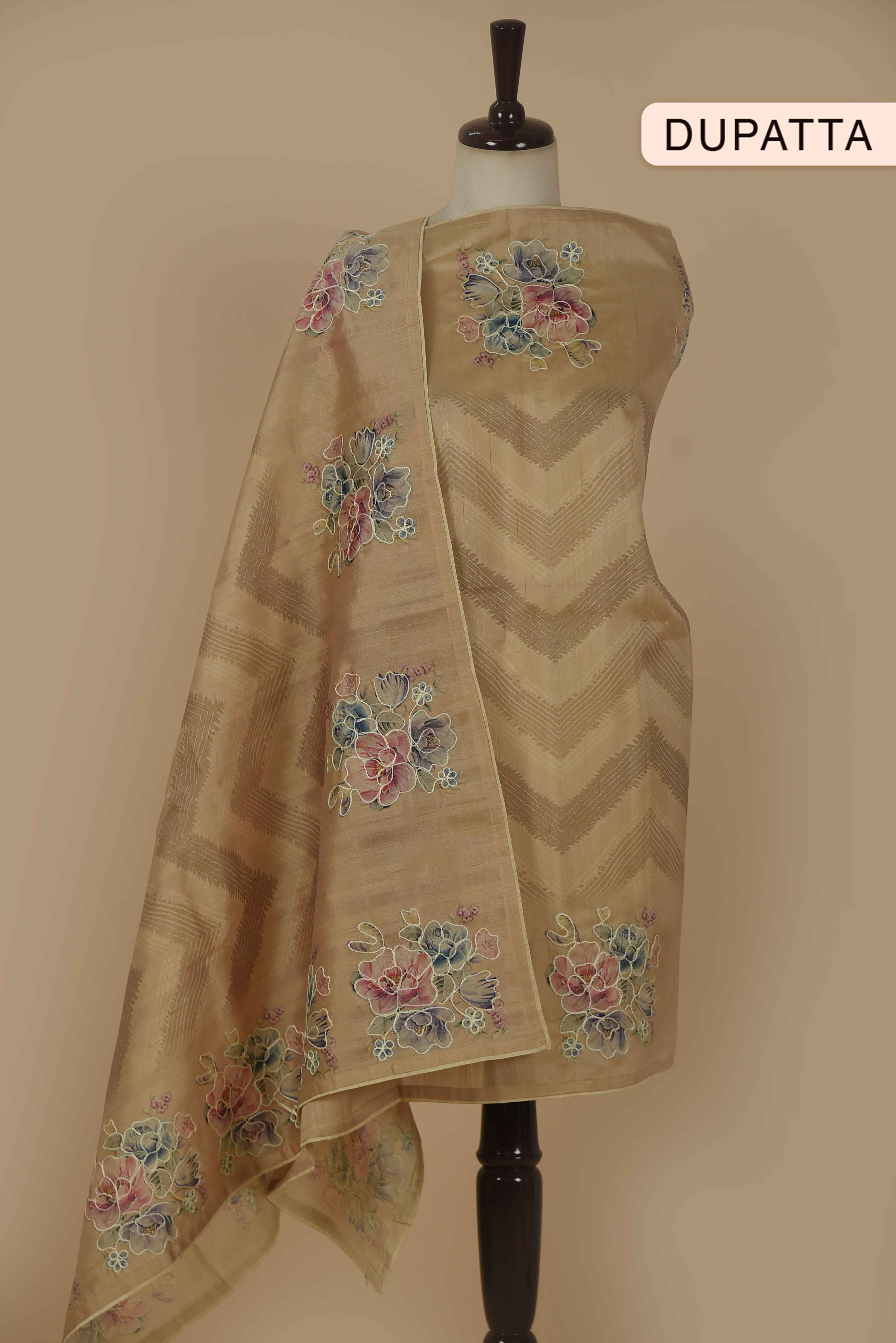 Beige Silk Blend Printed With Embroidered Unstitched Suit Fabric Set With Silk Dupatta