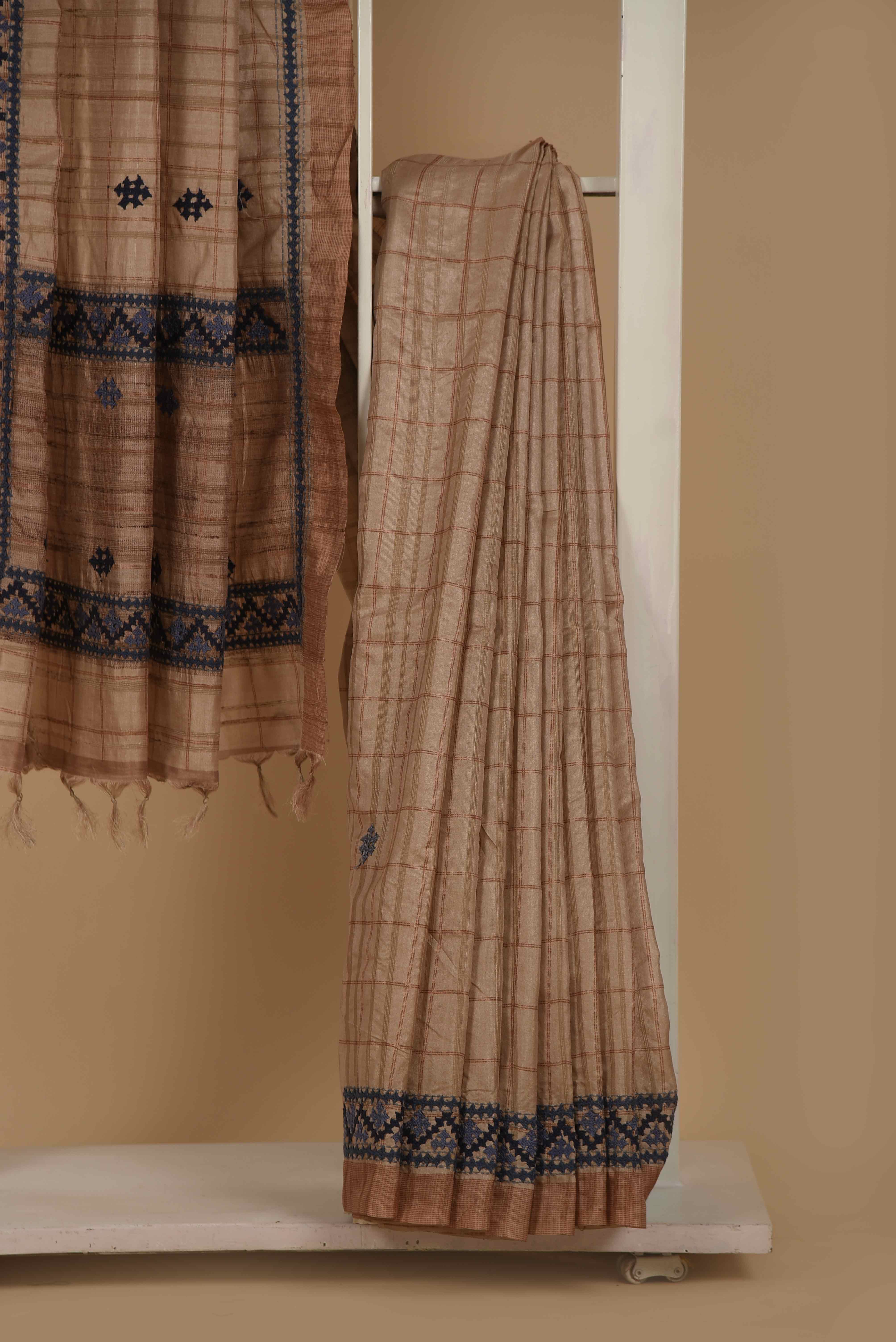 Experience elegance with this Beige and Blue Cotton Silk Blend Embroidered Saree, paired with a matching embroidered blouse.
