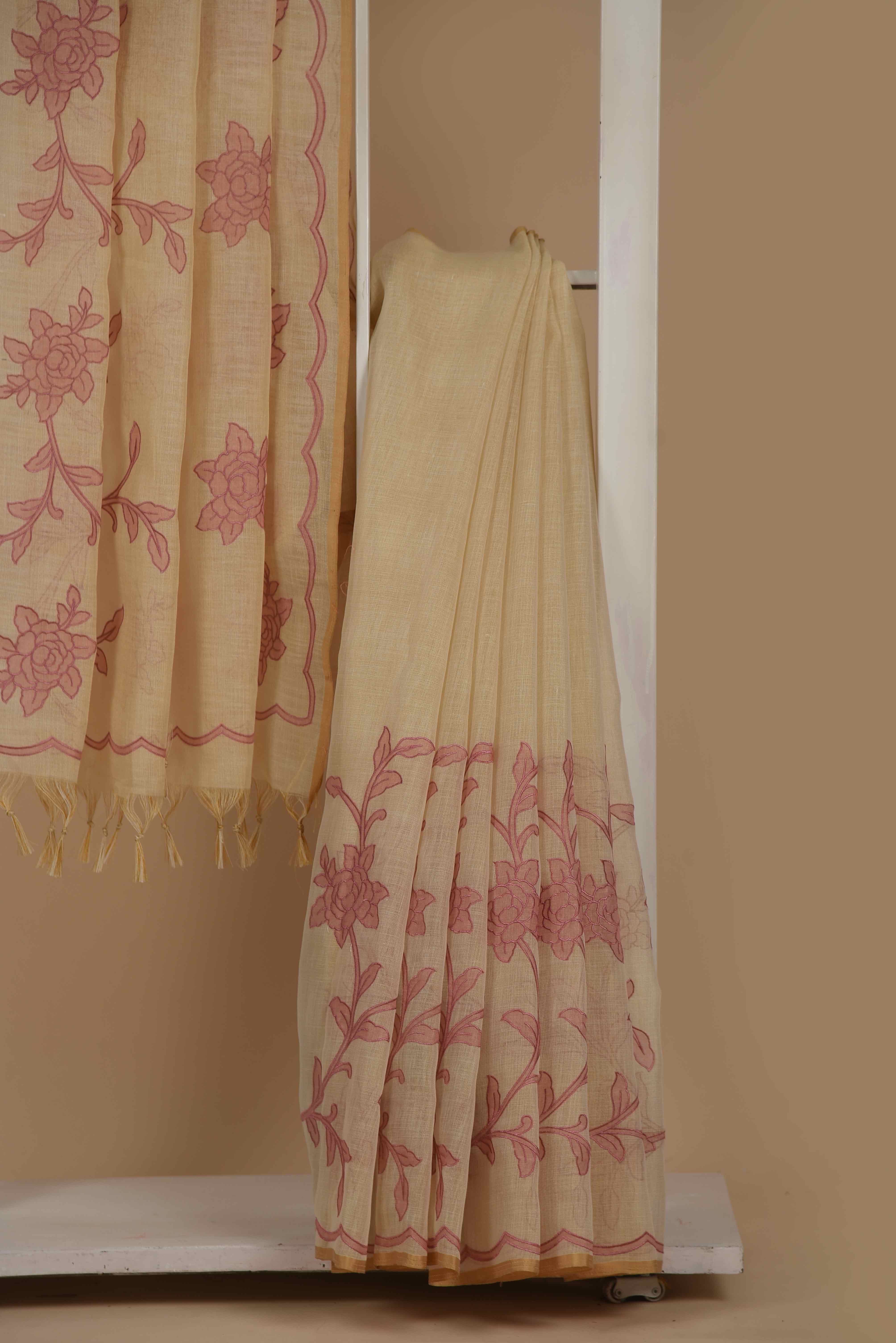 Beige With Pink Linen Blend Embroidered Saree with Linen Embroidered Blouse