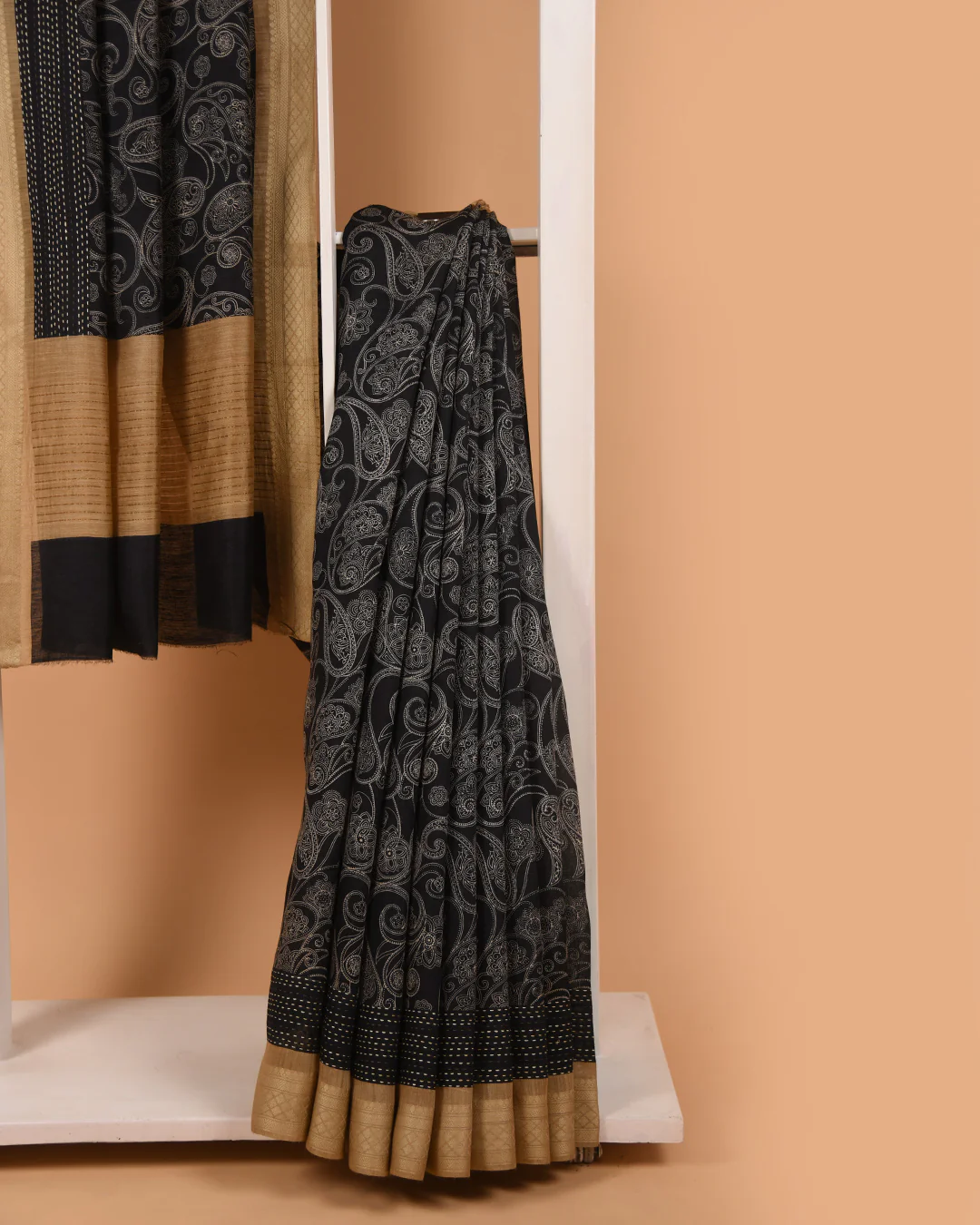 Black With Beige Pure Handloom Silk Embroidered Saree With Contrast Handloom Silk Blouse