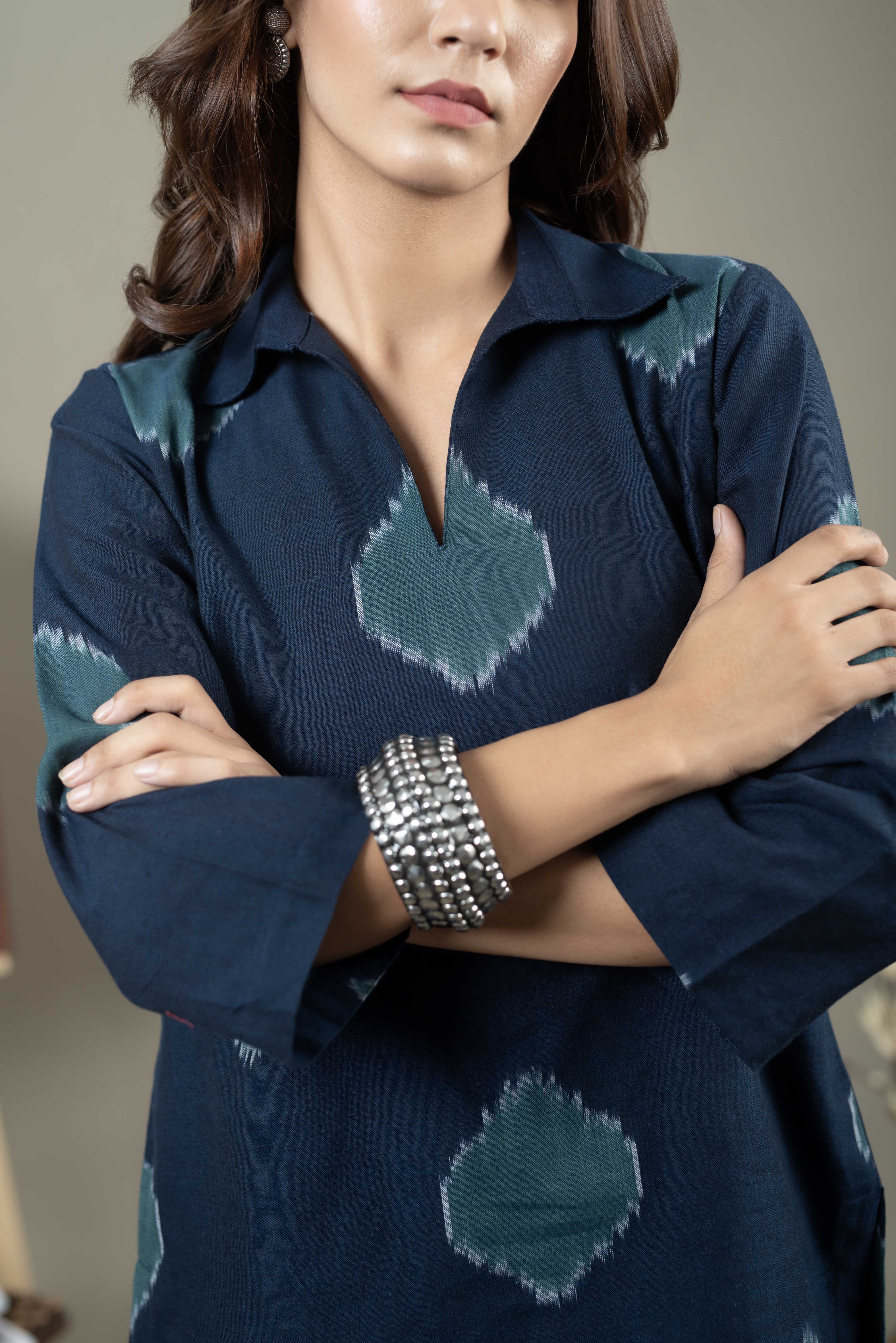 Crafted from fine cotton handloom fabric, the Blue Pure Handloom Ikat Cotton Co-ord Set offers a perfect blend of comfort and style.