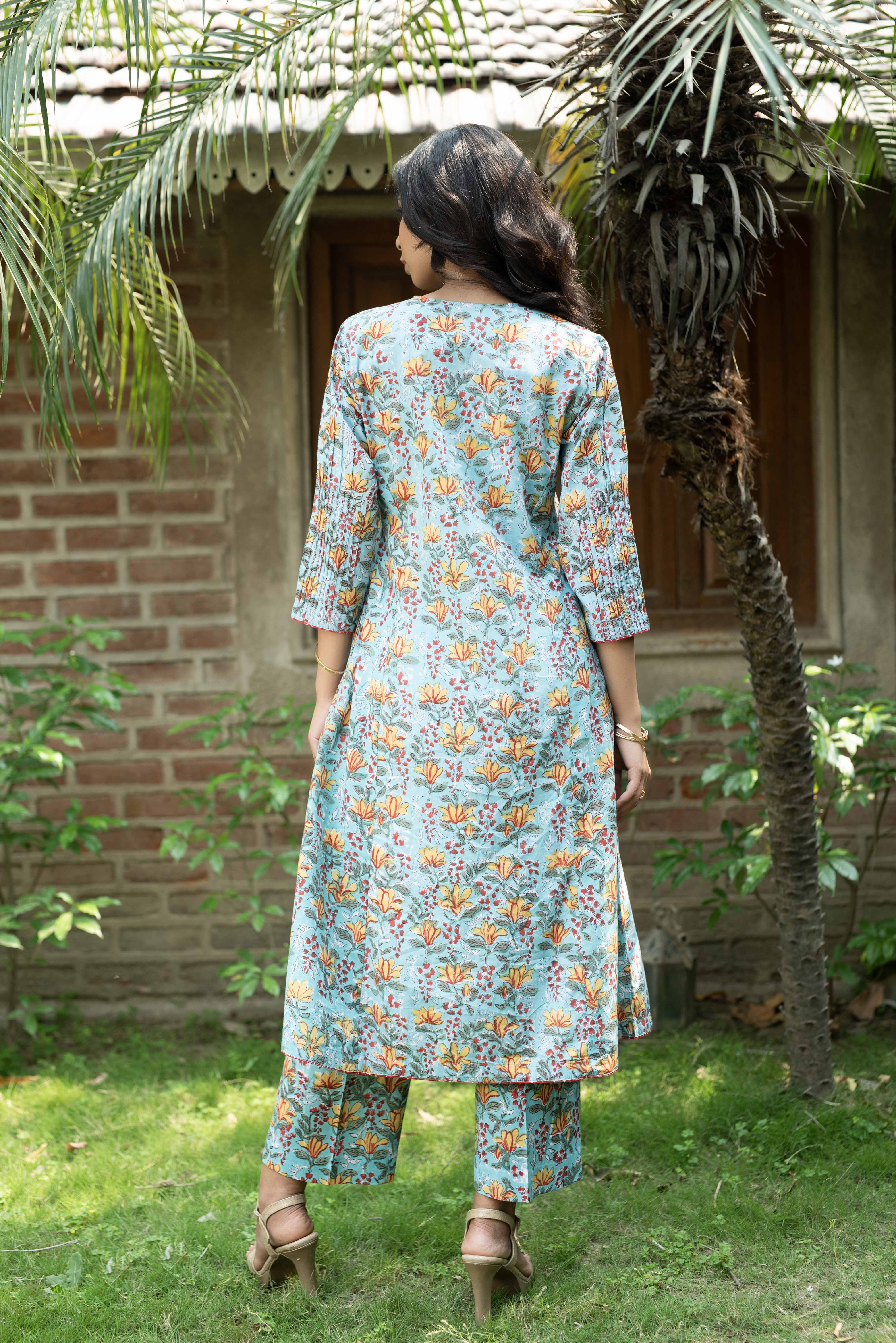 This blue and yellow hand block printed A-line kurta set is crafted from pure cotton, ensuring comfort and breathability.