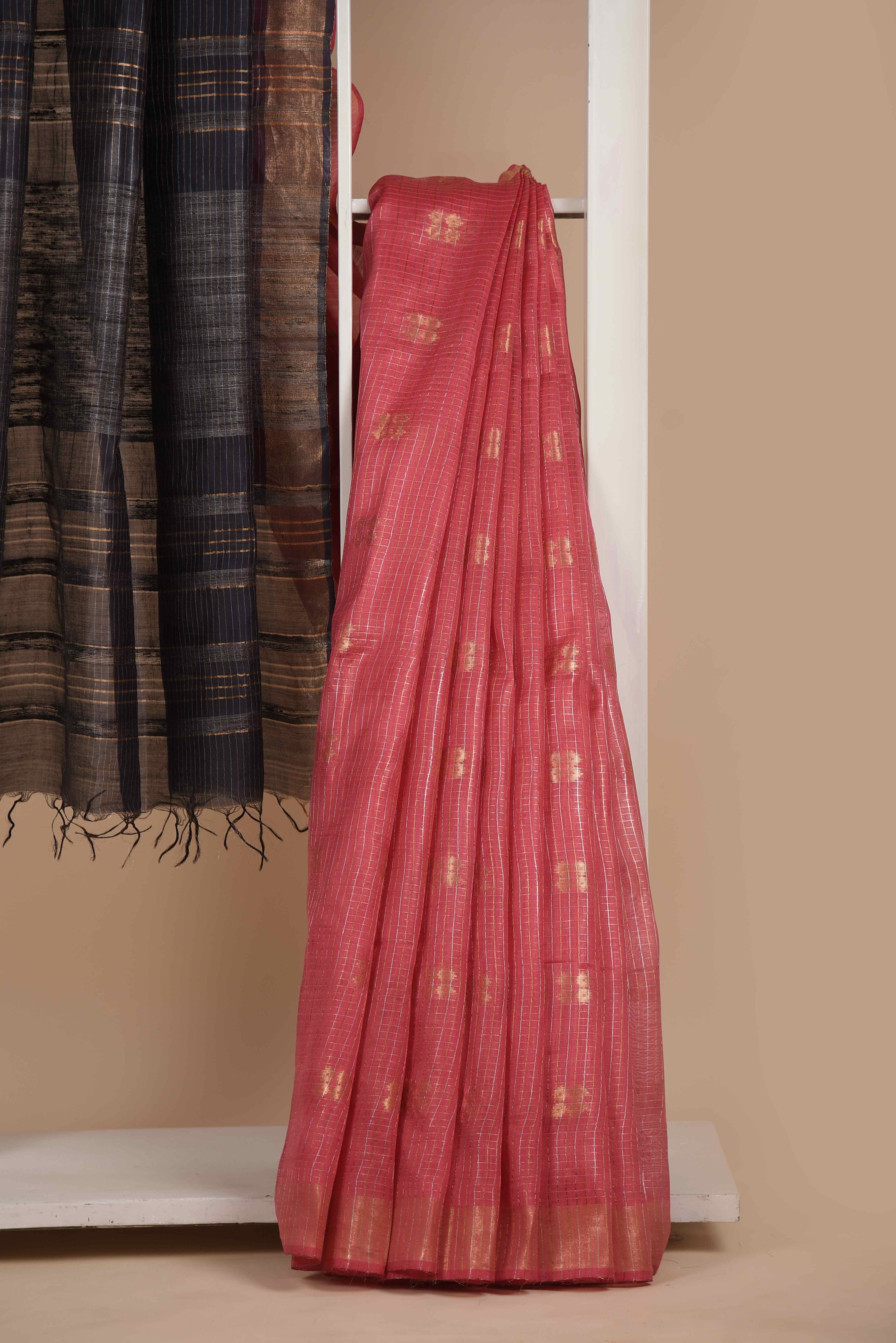 Brick Red Tussar Silk Blend Woven Saree with Woven Tussar Silk Blend Blouse