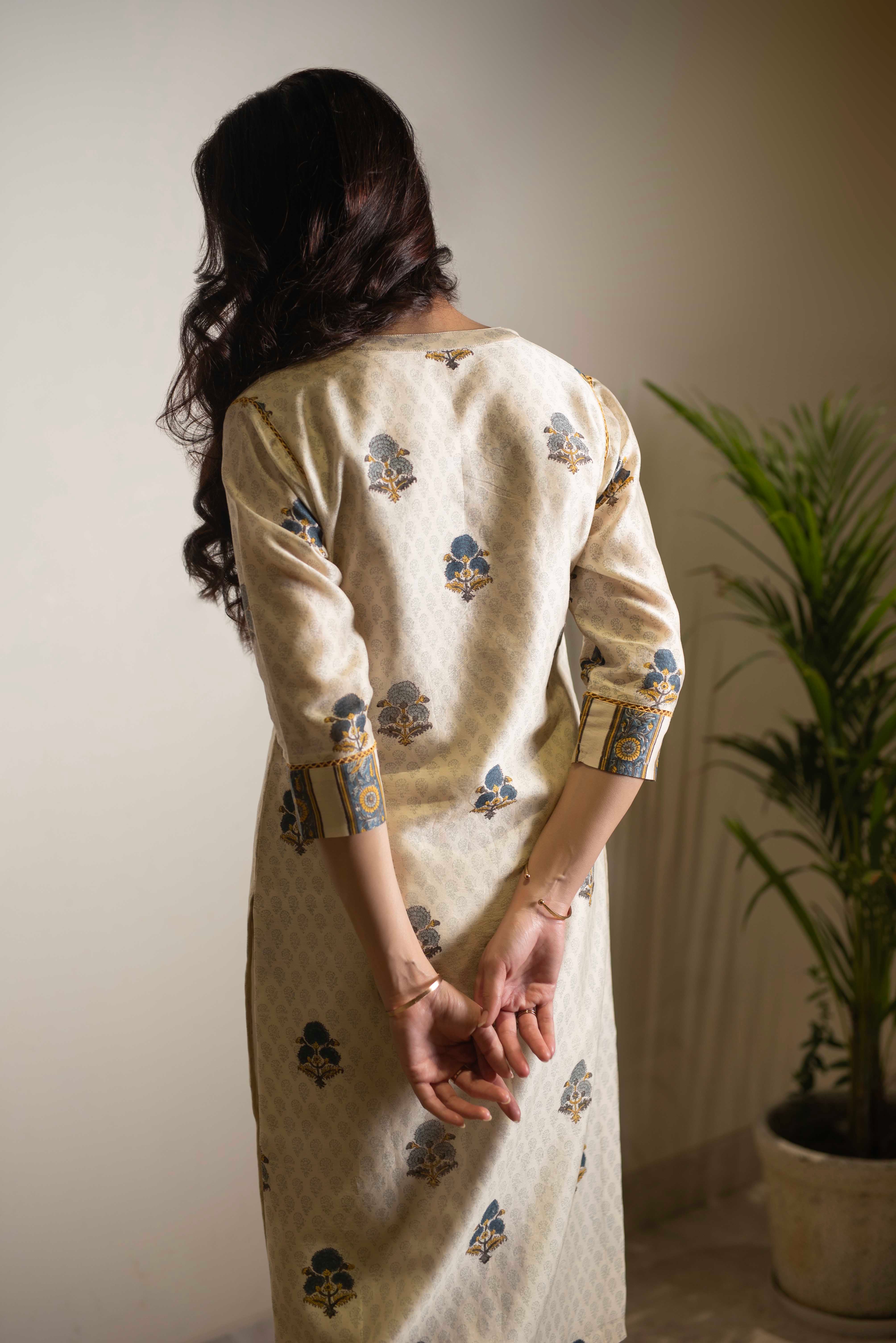 Cream Chanderi Hand Block Printed Straight Kurta Set With Pant - Regular Fit