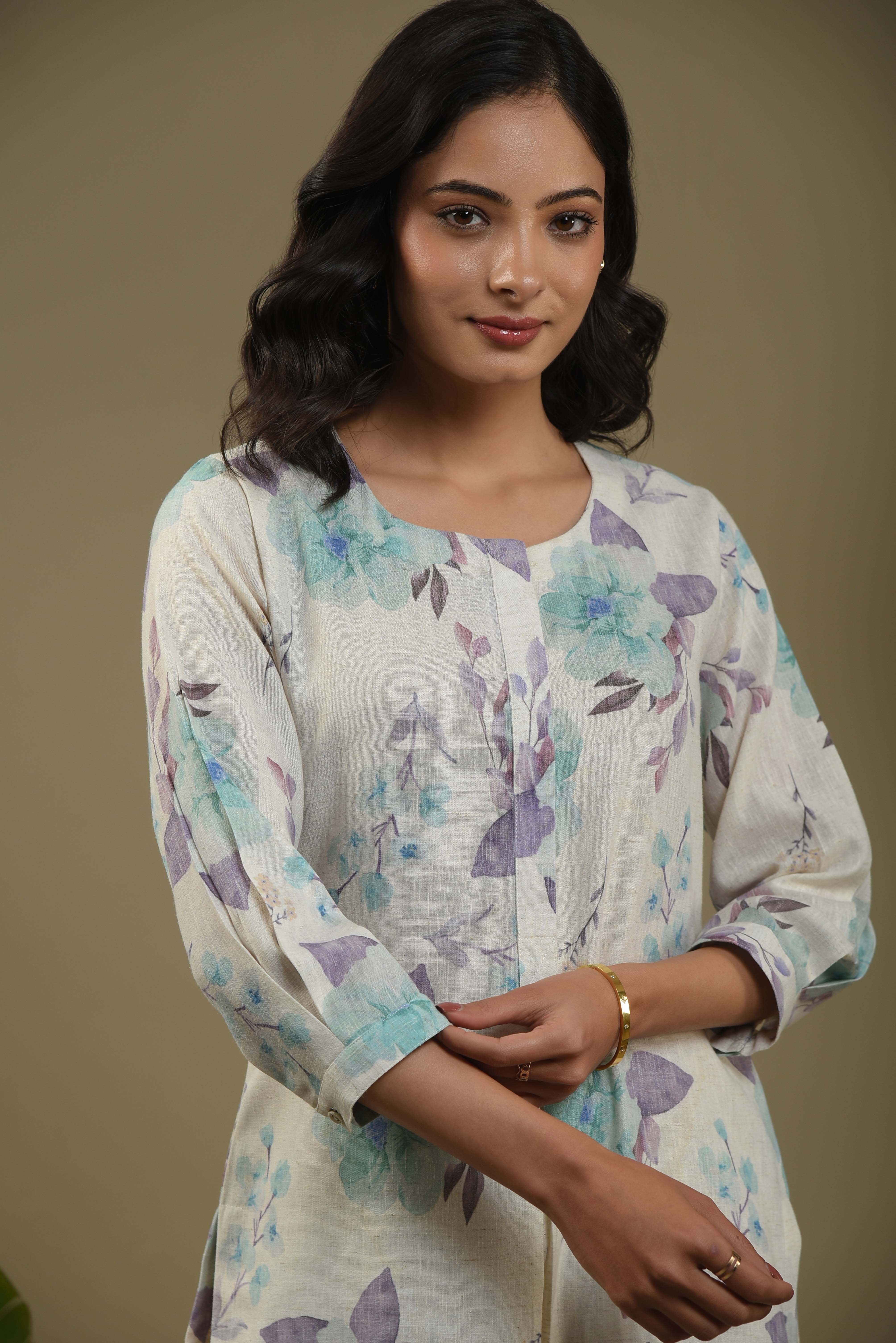Cream & Green Floral Linen Blend Staright Kurta Set With Culotte Pants - Regular Fit