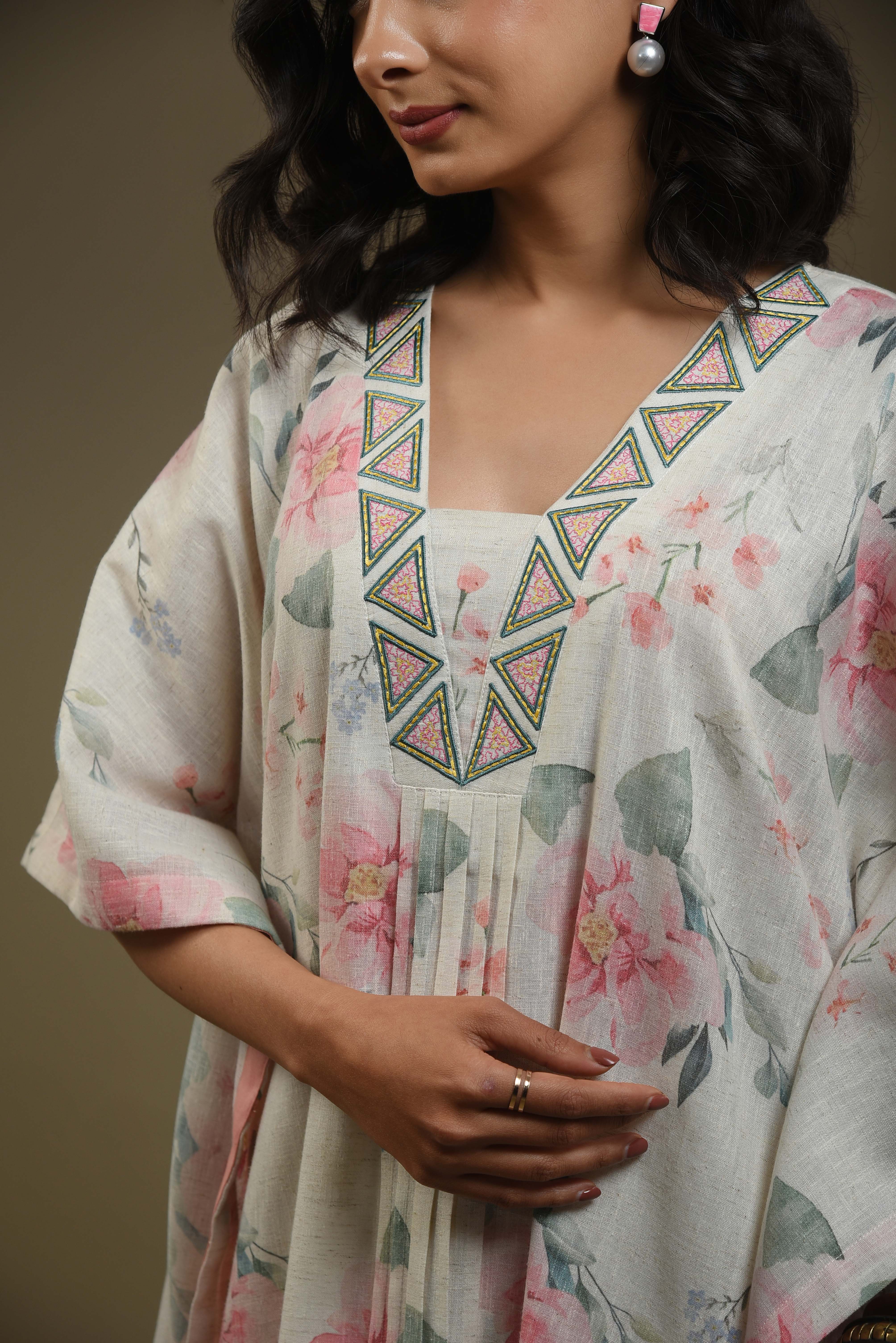 Cream & Pink Floral Linen Blend Kaftan With Straight Pant