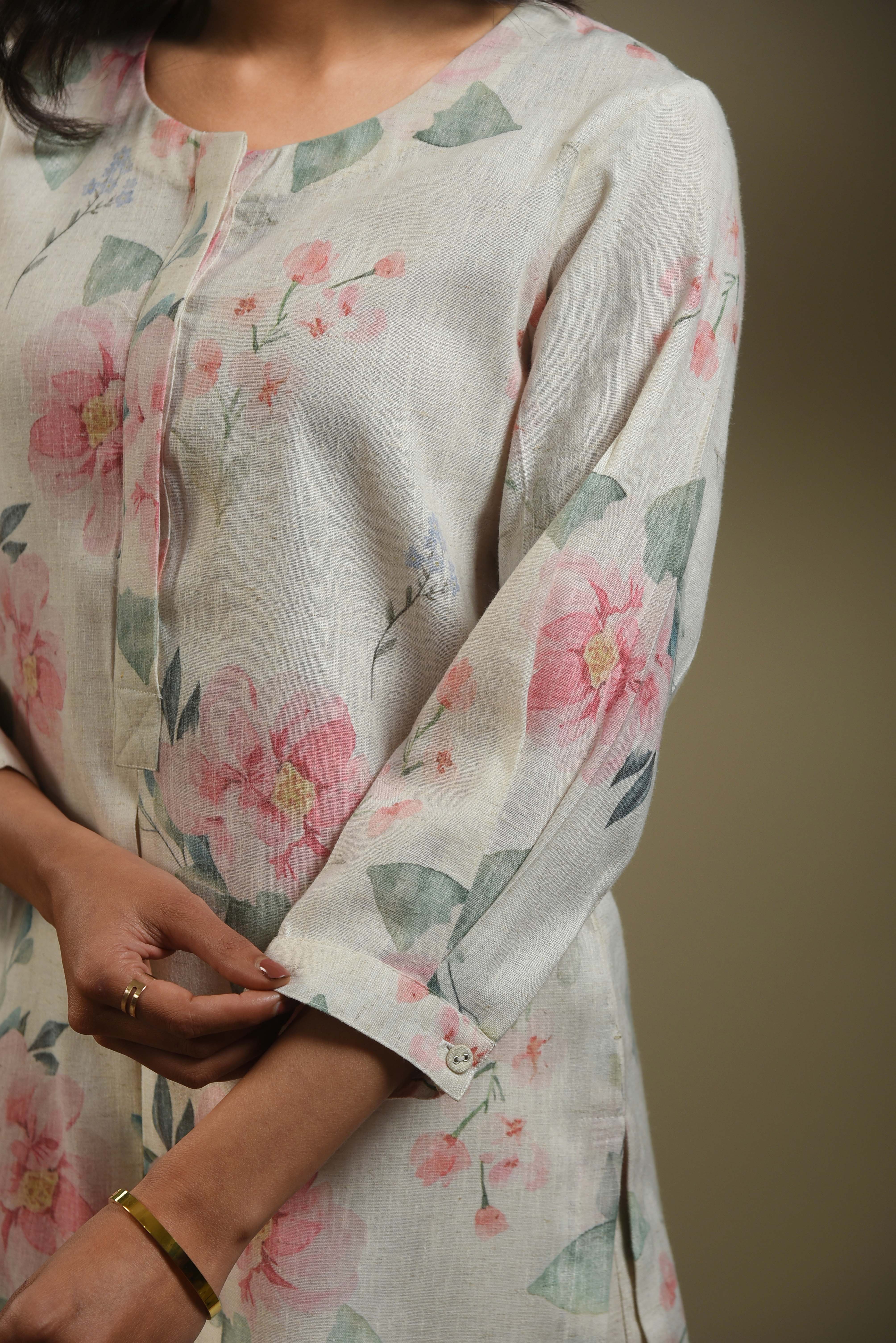 Cream & Pink Floral Linen Blend Straight Kurta Set With Culotte Pants - Regular Fit