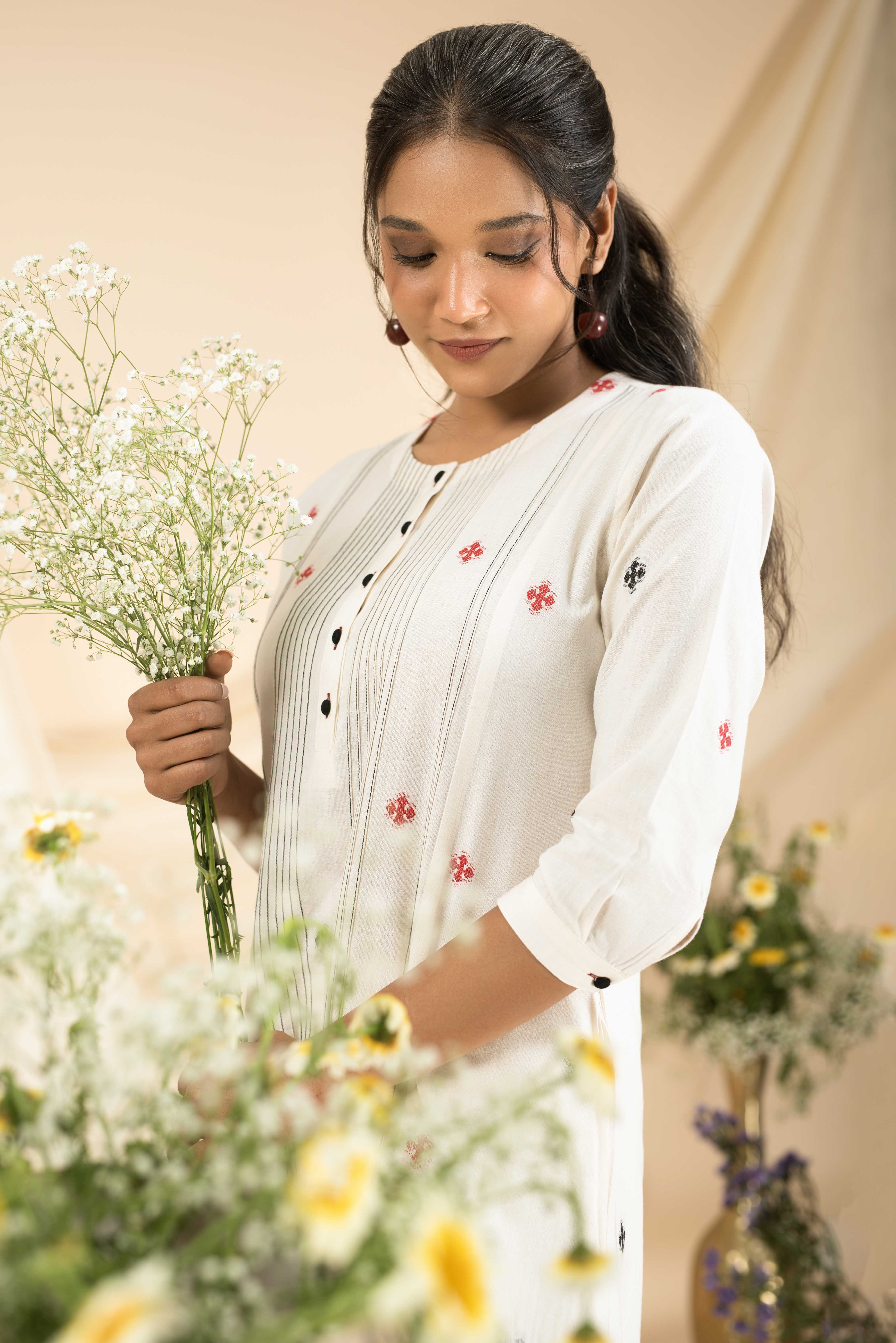Experience the luxury of exquisitely crafted Cream Pure Cotton Jamdani Kurta Set.