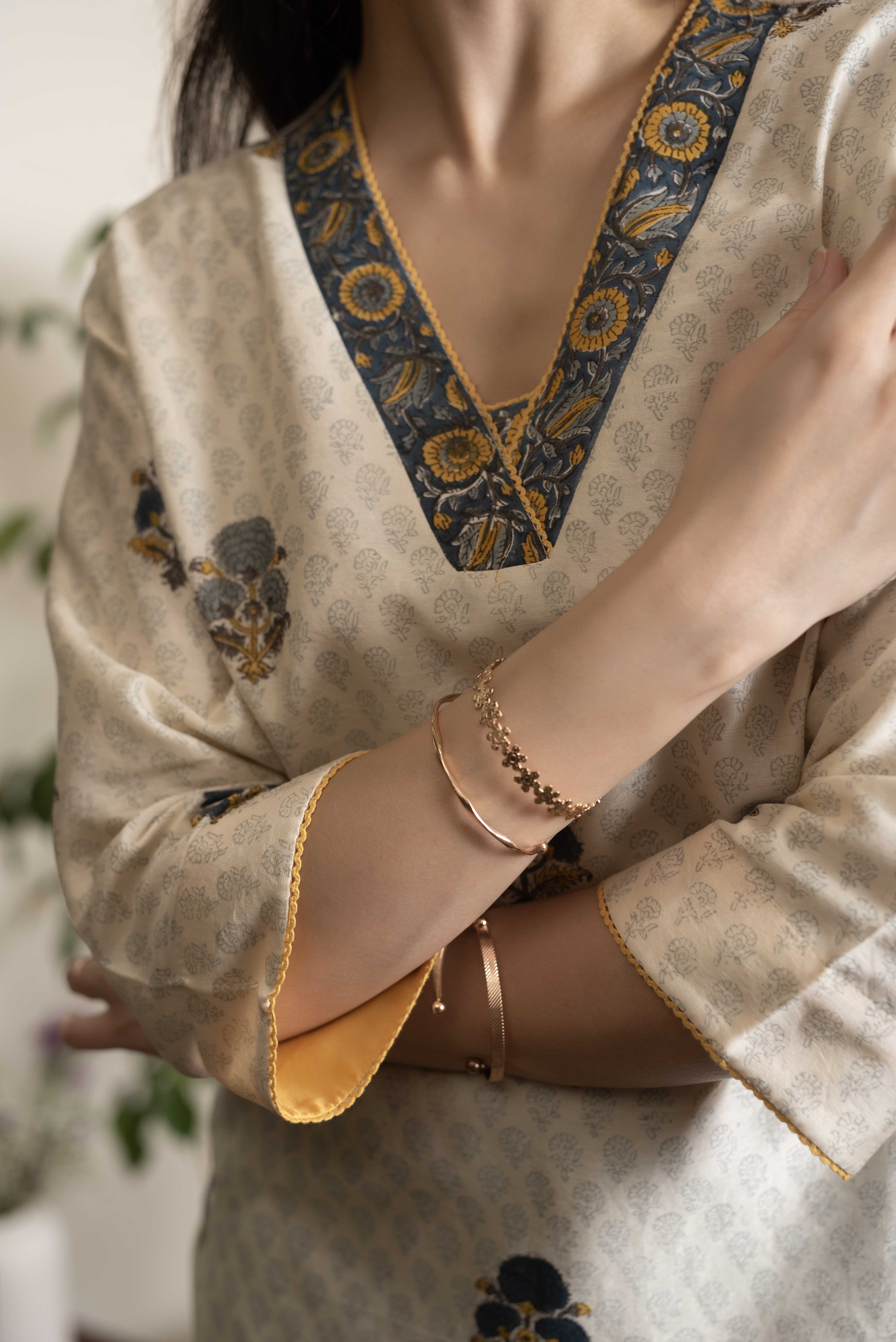 - Adorned with intricate blue hand block prints on a soothing cream base, this kurti is a timeless blend of tradition and modern style.