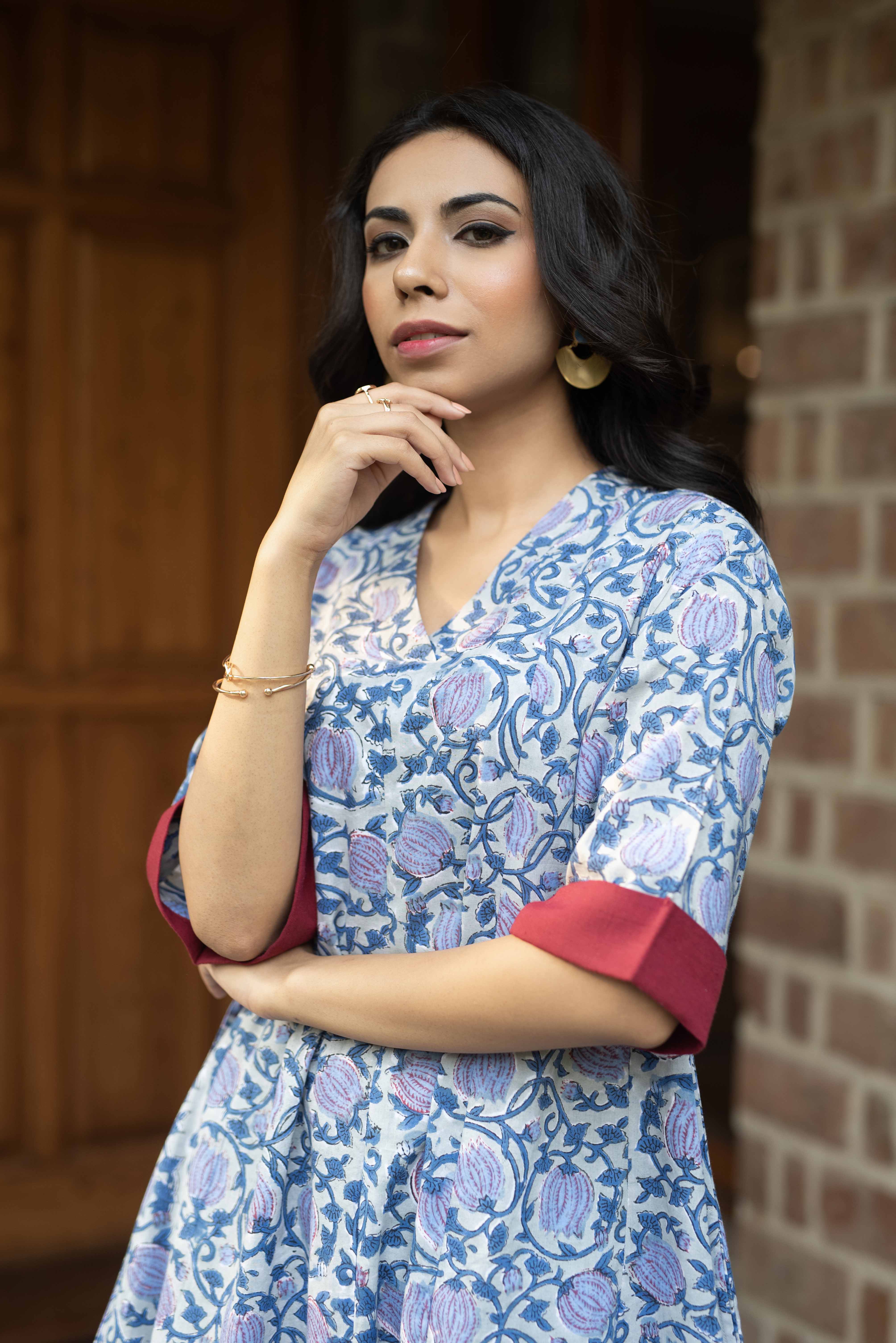 Gray With Blue Pure Cotton Hand Block Printed A-Line Kurta with Pants – Boxy Fit