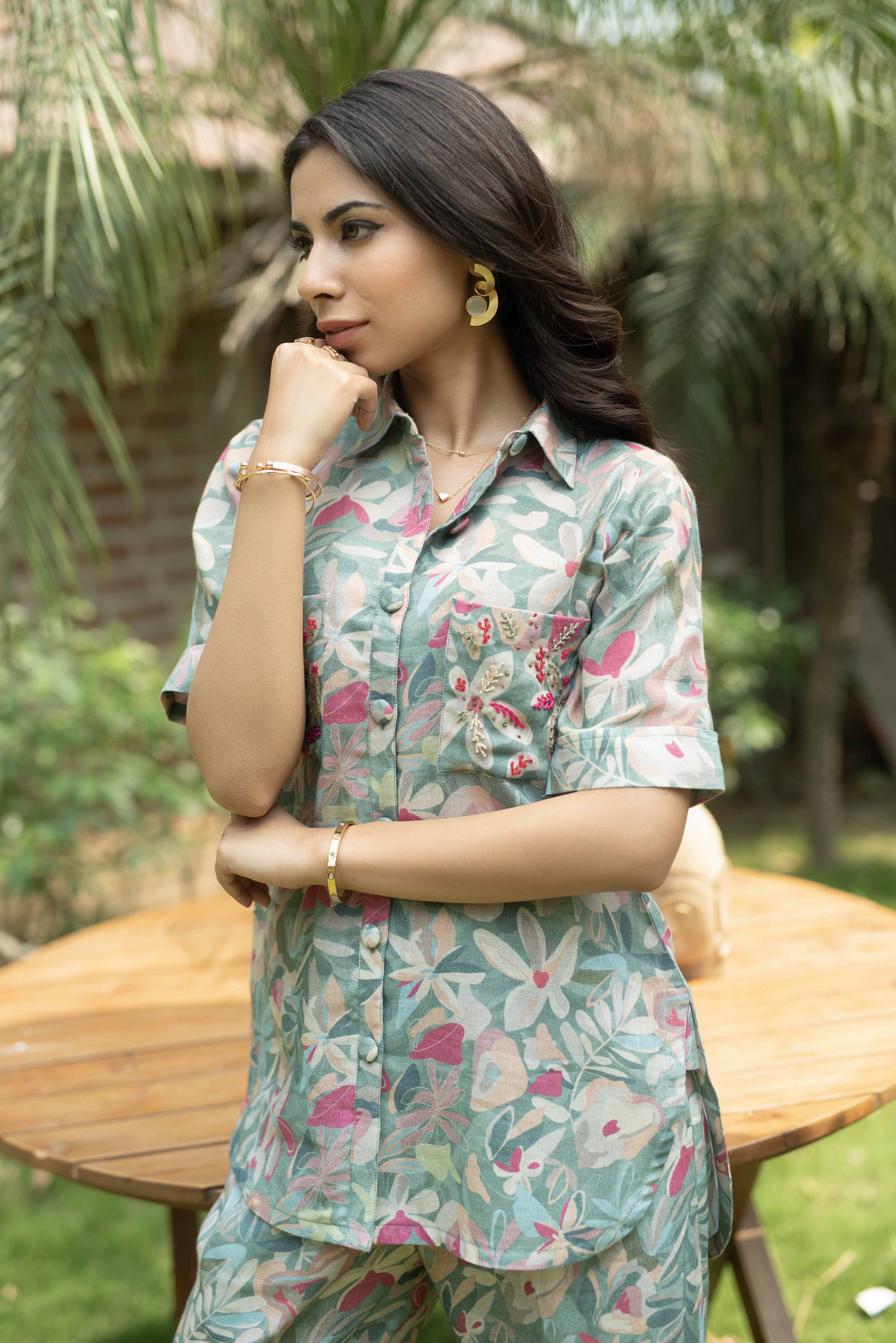 Green Linen Digital Printed Co-ord Set - Regular Fit