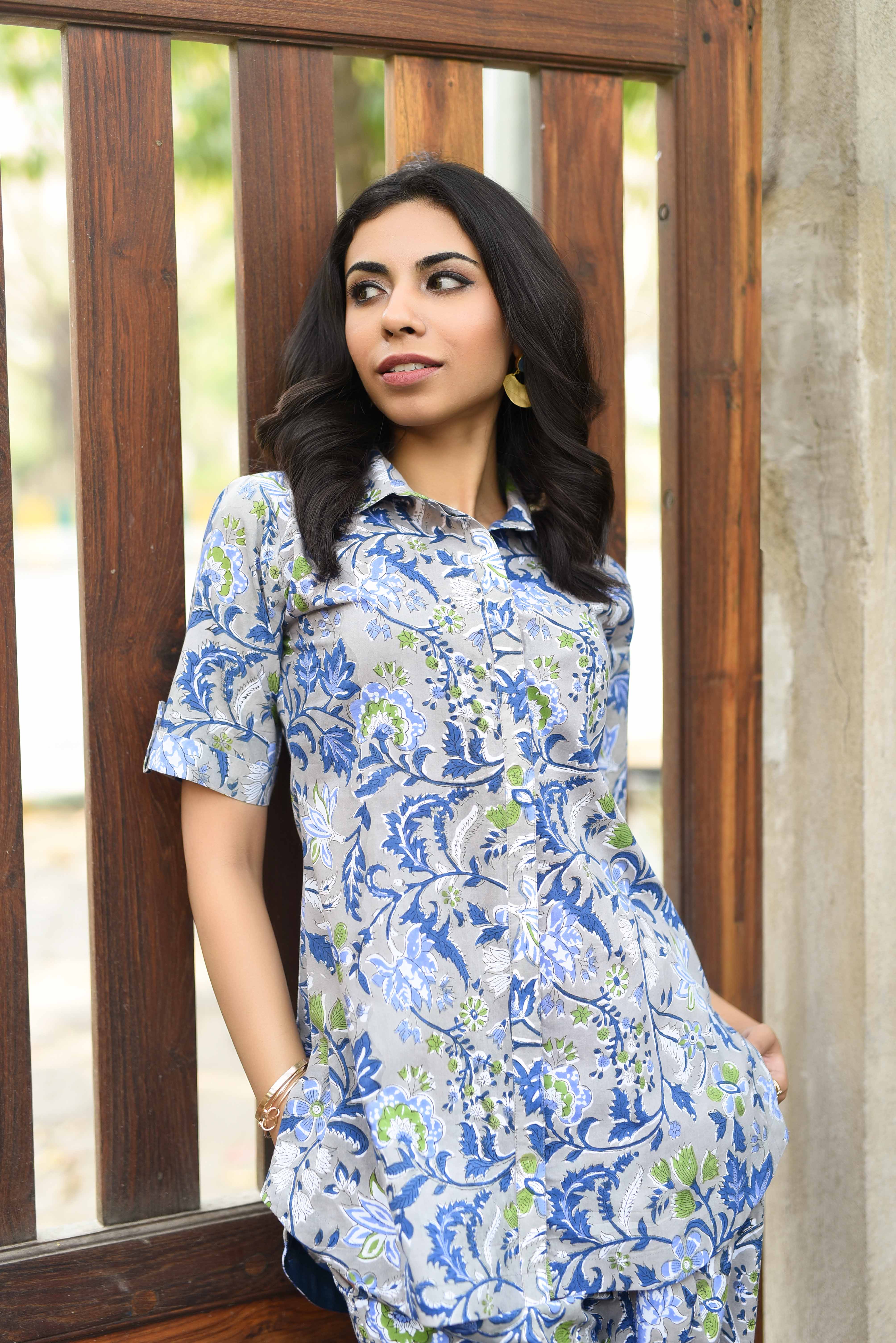 Grey With Blue Pure Cotton Hand Block Printed Regular Fit Co-ord Set