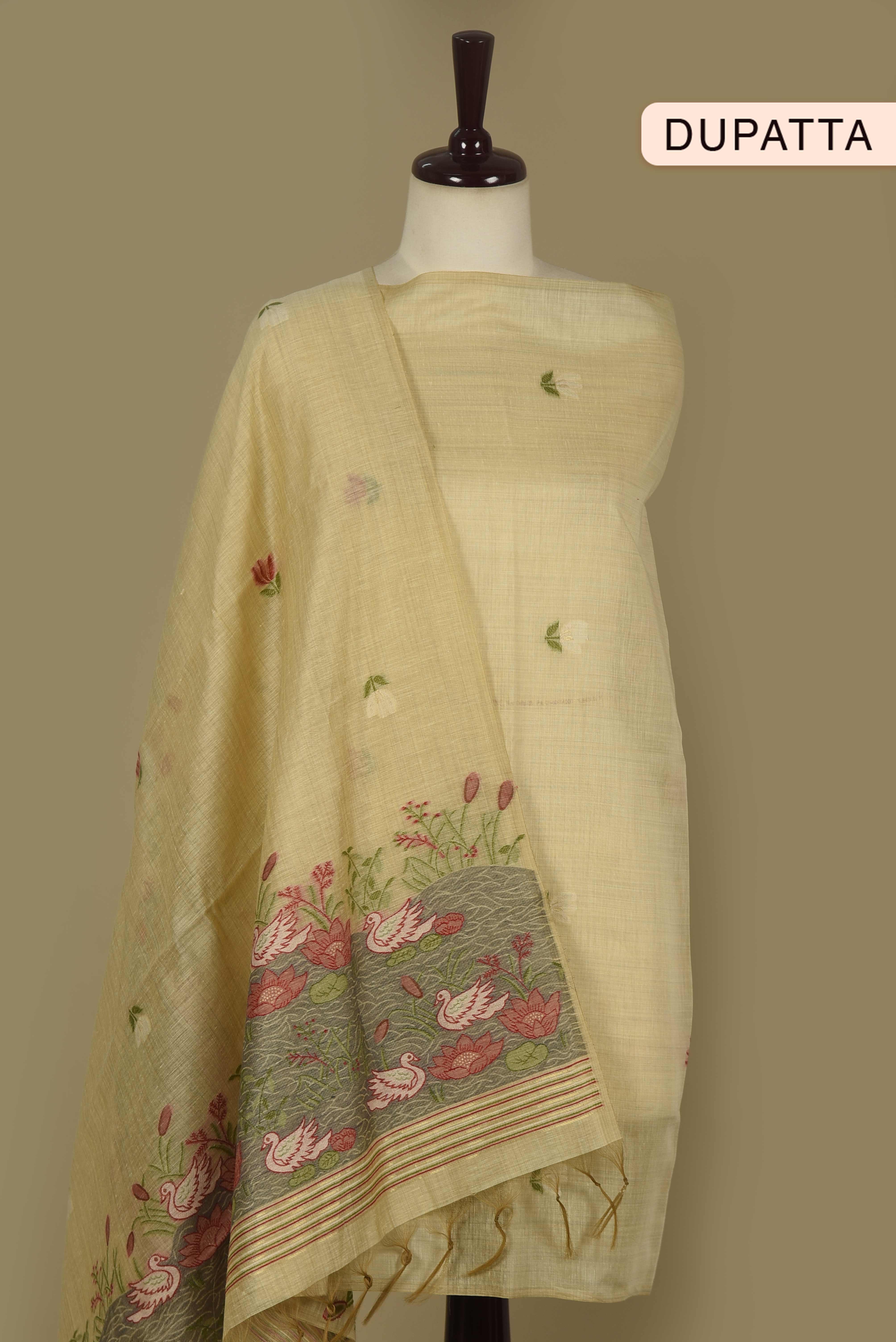 Light Pista Green Chanderi Jamdani Woven Unstitched Suit Fabric Set with Multicolor Chanderi Woven Dupatta.