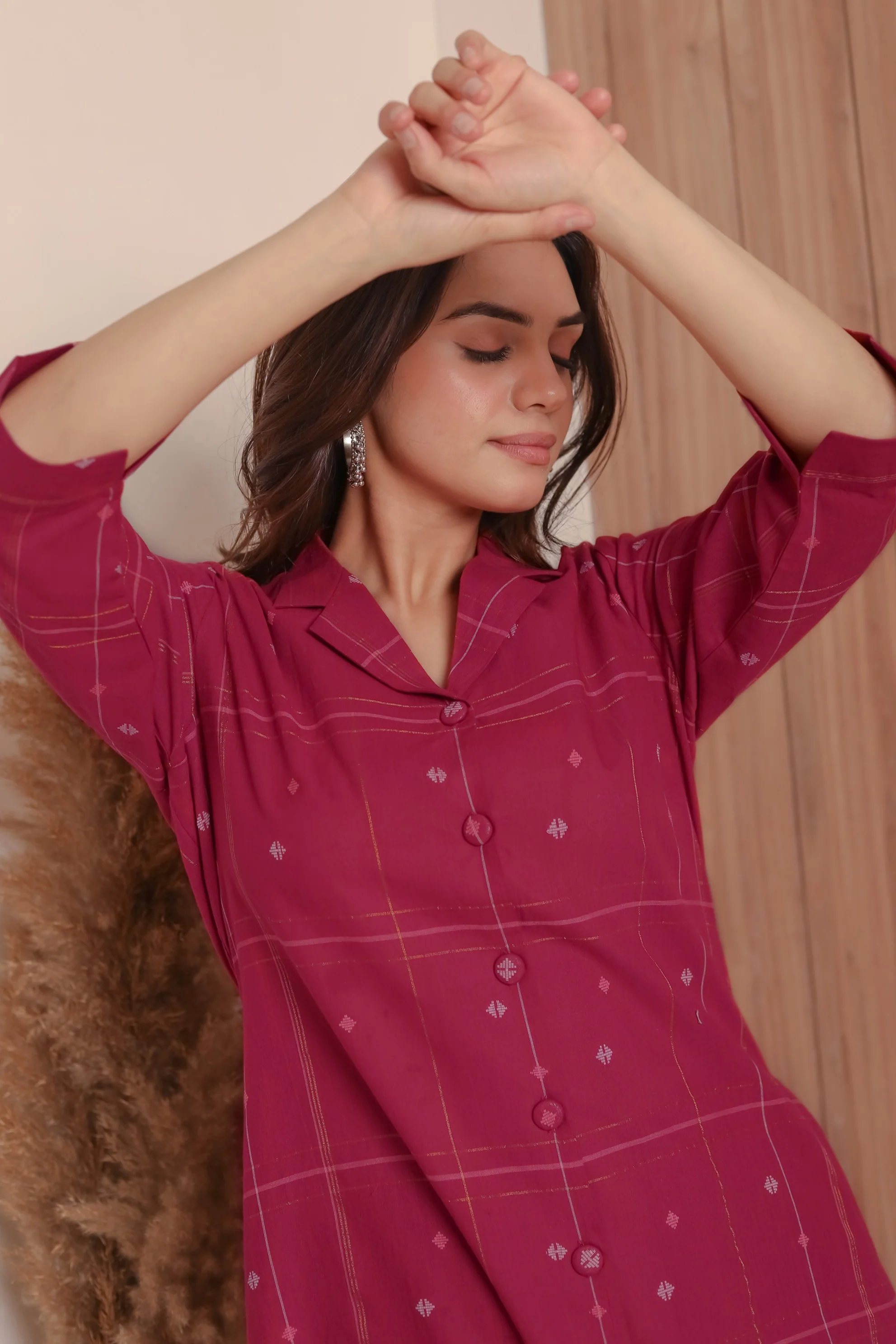 Effortlessly chic and luxurious, our Deep Pink Cotton Handloom Co-ord Set is perfect for elegant dinner outings.