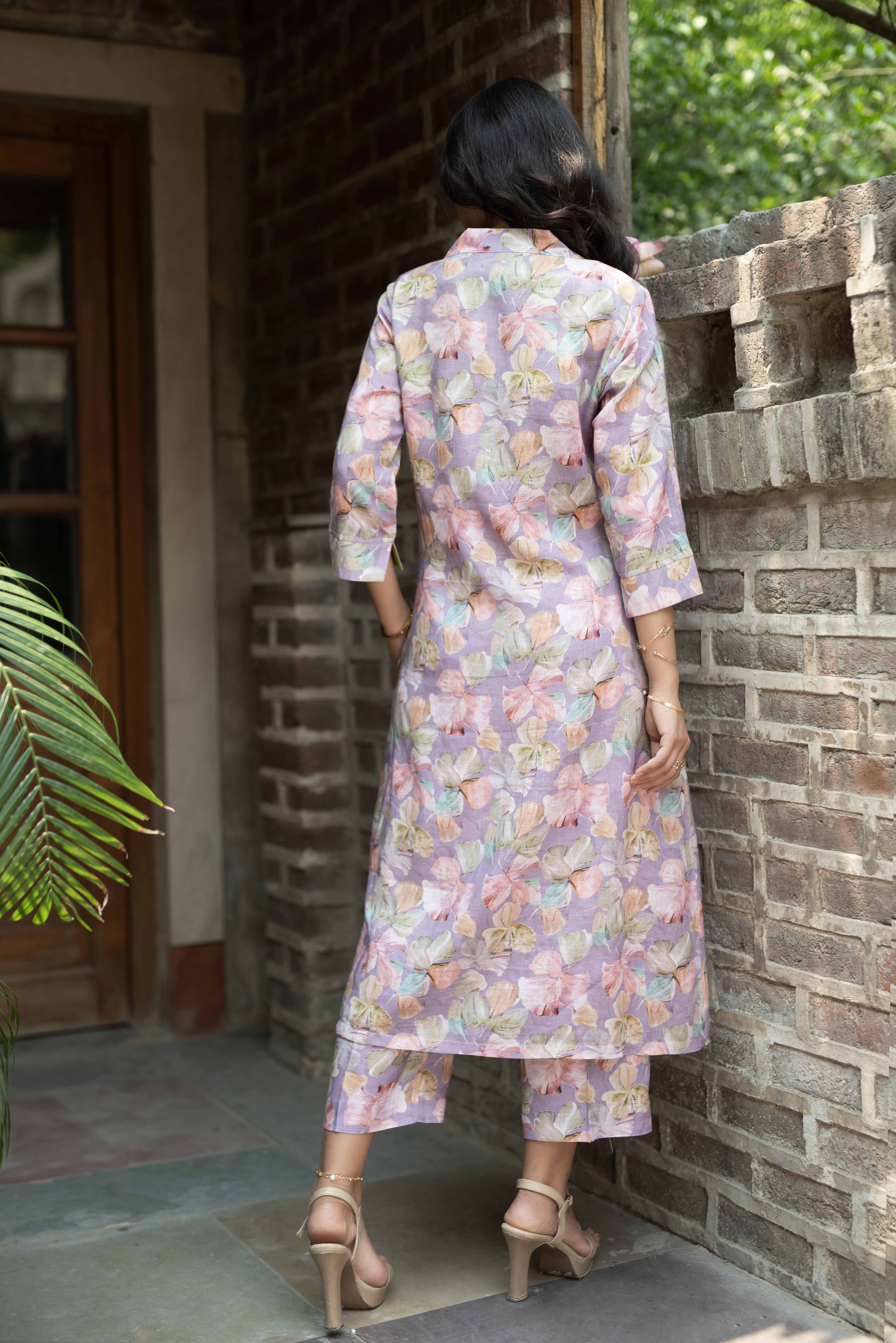 This mauve linen printed A-line kurta paired with matching culottes offers a comfortable regular fit, ideal for both casual and semi-formal occasions.