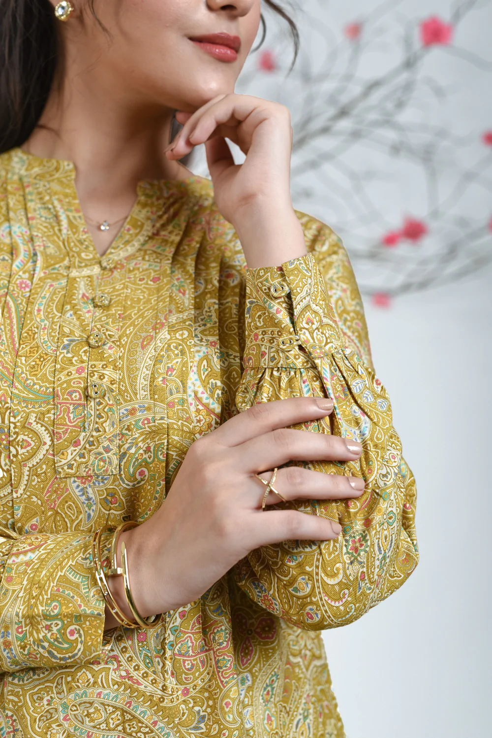 - Classy mustard printed shirt featuring delicate paisley motifs, pintuck detailing on the yoke, and long sleeves with buttoned cuffs.