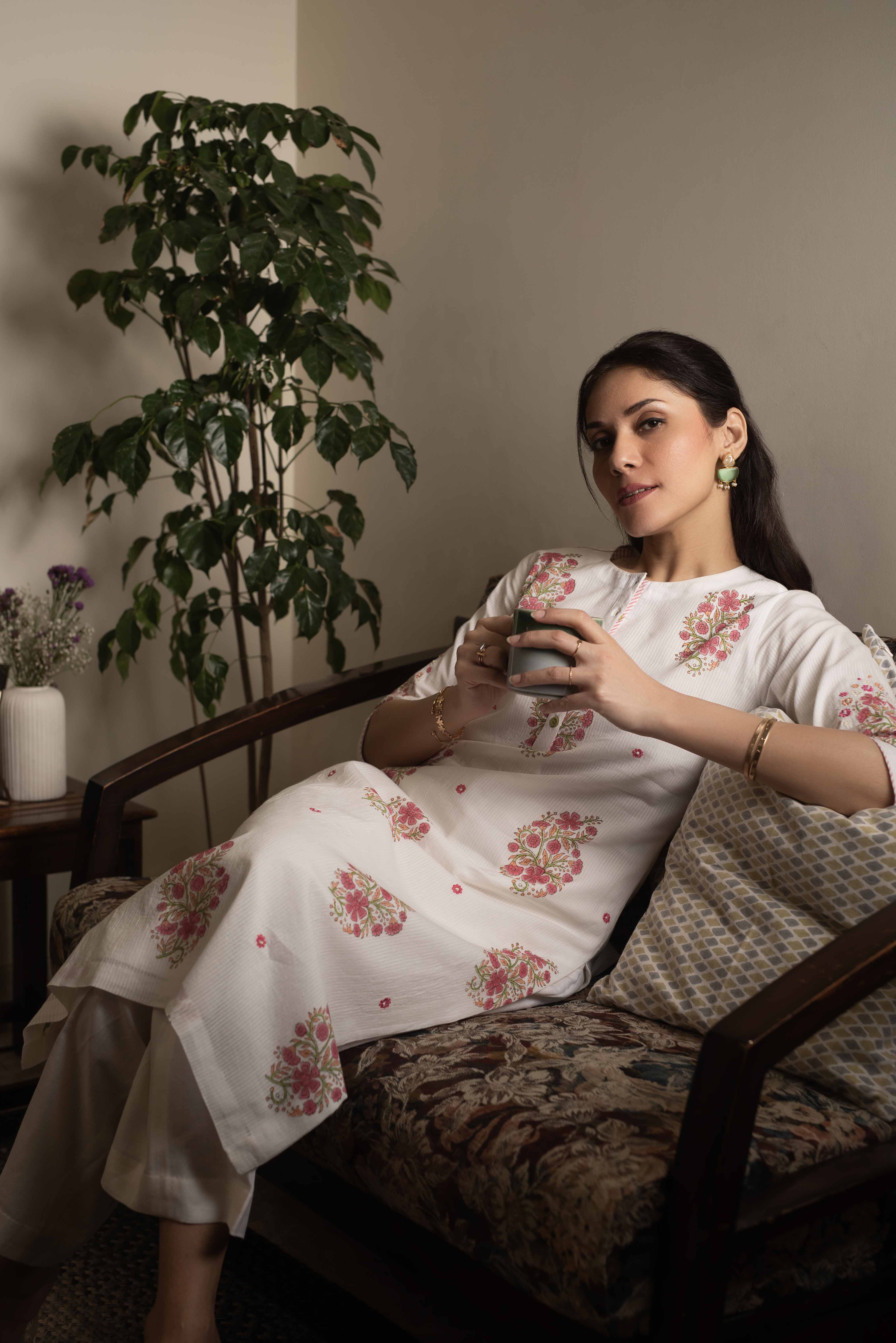 Expertly crafted Off White With Pink Cotton Dobby Kurta featuring traditional hand block printing and delicate embroidery.