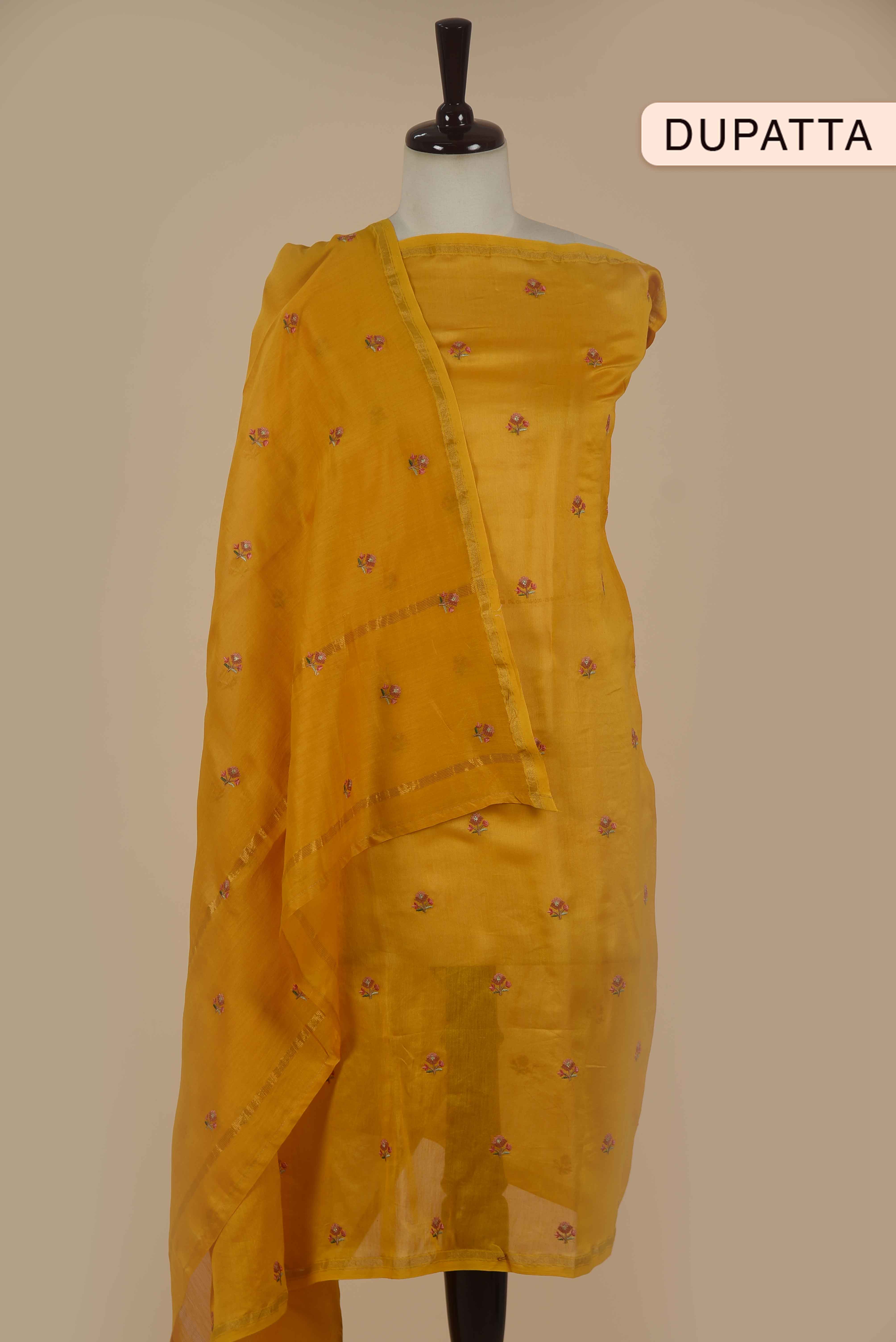 Yellow Chanderi Embroidered Unstitched Suit Fabric Set with Chanderi Dupatta