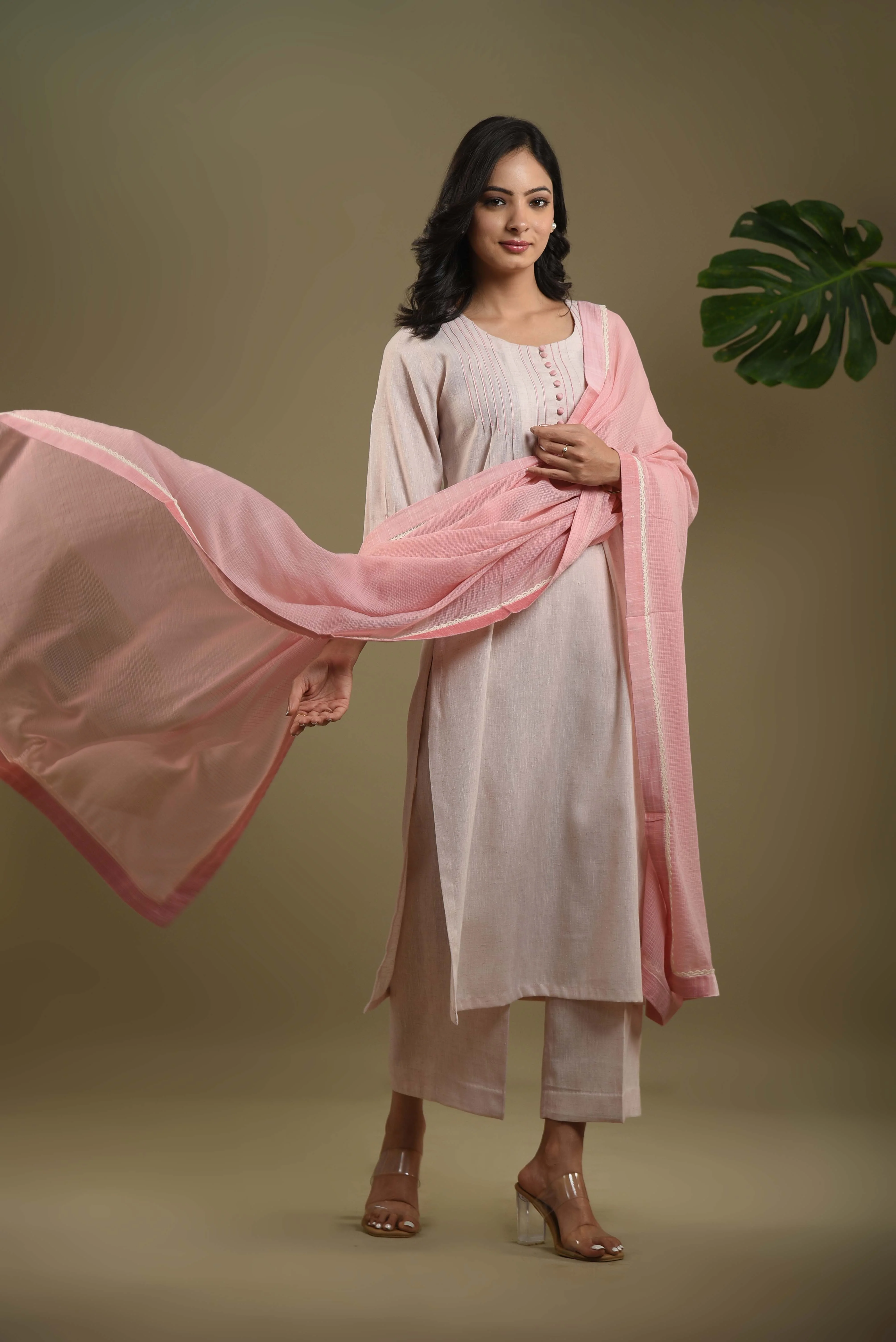 Elegant blush pink kurta set in fine cotton linen Blend fabric designed with fine pintuck detailing and fabric buttons on the front yoke for a graceful touch.