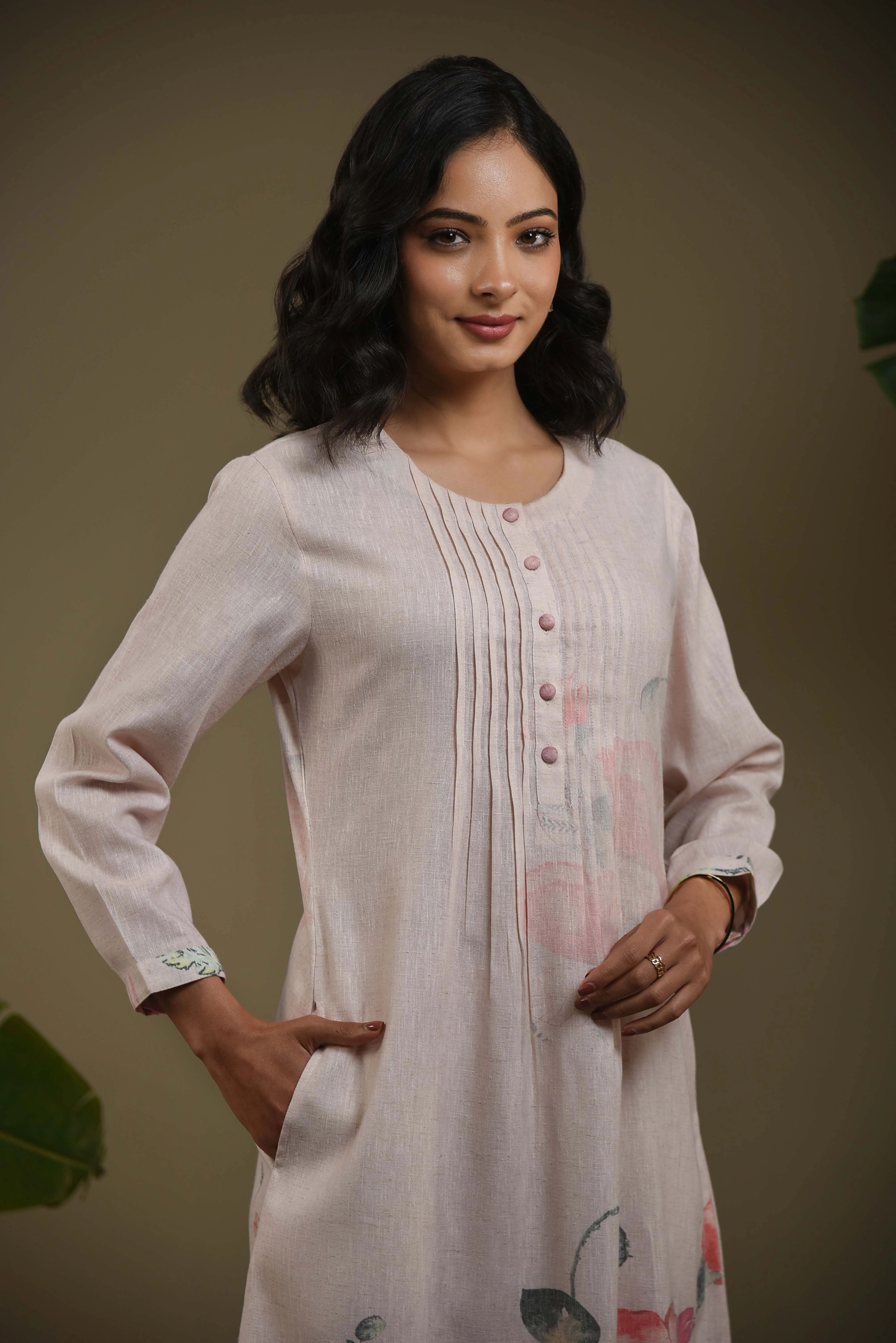 Experience timeless sophistication with this Pink Floral Linen Blend A-Line Kurta Set, a masterfully designed ensemble for the contemporary wardrobe.