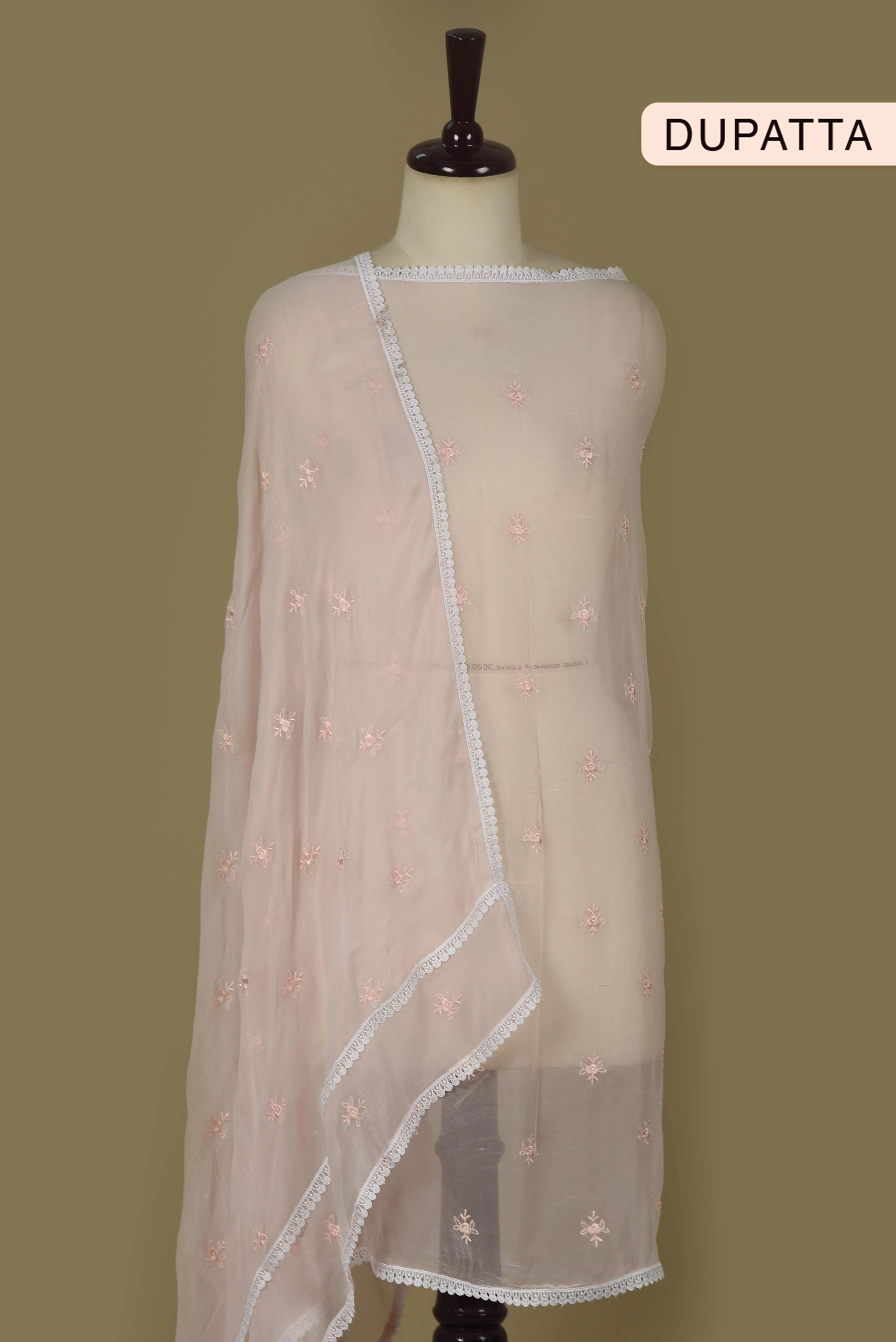 Powder Pink Pure Cotton Printed & Embroidered Unstitched Suit Fabric Set with Chiffon Embroidered Dupatta.
