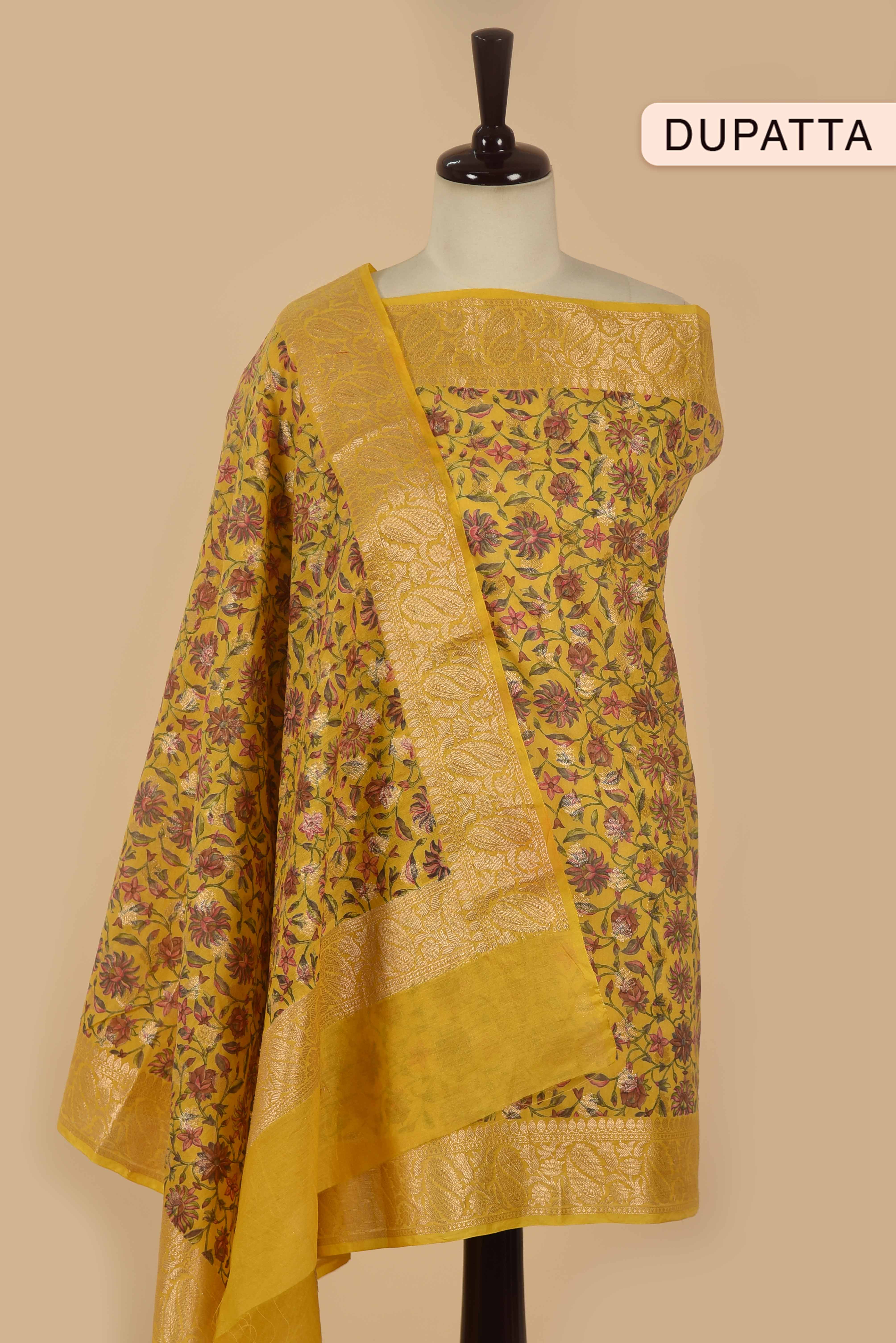 - Radiate timeless charm with our Yellow Chanderi Silk Printed & Woven Unstitched Suit Fabric Set, paired with a matching Chanderi Printed Woven Dupatta.