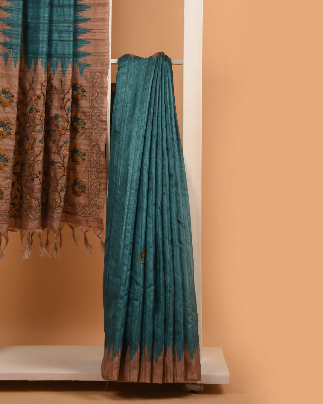 - Elevate your style with our Turquoise With Beige Silk Cotton Blend Embroidered Saree.